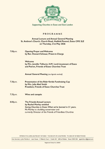 The Friends Annual Lecture and Annual General Meeting and will be held at St. Andrew’s Church, Church Road, Hatfield Peverel,... read more -