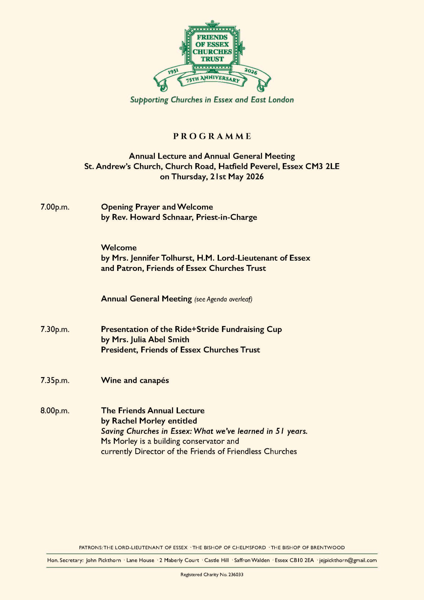 The Friends Annual Lecture and Annual General Meeting and will be held at St. Andrew’s Church, Church Road, Hatfield Peverel, Essex CM3 2LE on Thursday, 21st May 2026.