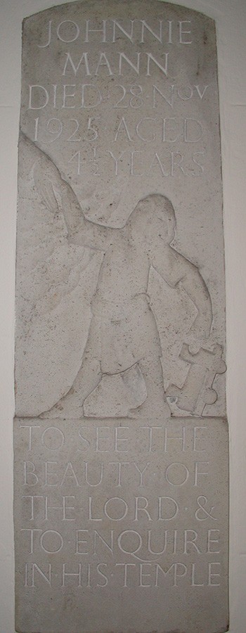 Church monuments include those to Edward North Buxton (1840-1924) and his wife Emily (1841-1929), and Johnnie Mann (1921-5). E.N. Buxton was briefly M.P. for Walthamstow, 1885-6, but is best remembered for his work as a conservationist; he played a major part in saving Epping Forest and Hainault Forest for public use, and he bought Hatfield Forest for the National Trust. Johnnie Mann suffered from osteomyelitis and died aged 4½. He is shown on his memorial leaving behind a toy steam engine and reaching up to taken the hand of Jesus. It was carved by Eric Gill, who was a friend of the family.