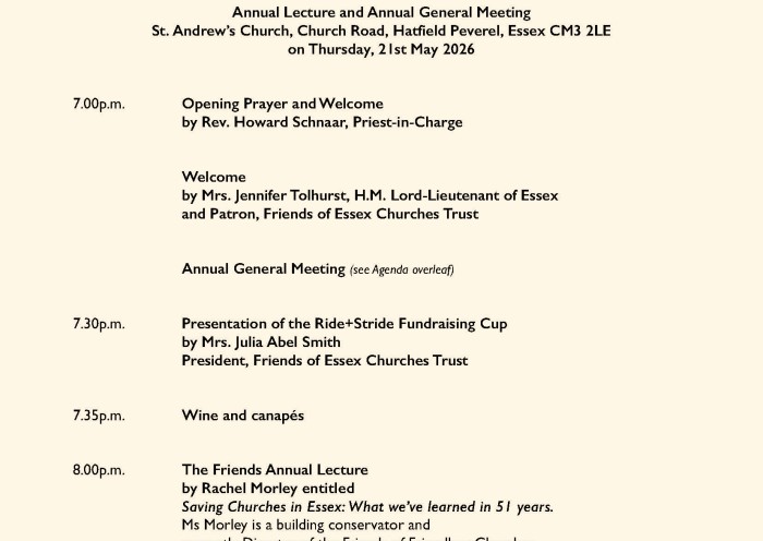 The Friends Annual Lecture and Annual General Meeting and will be held at St. Andrew’s Church, Church Road, Hatfield Peverel, Essex CM3 2LE on Thursday, 21st May 2026.